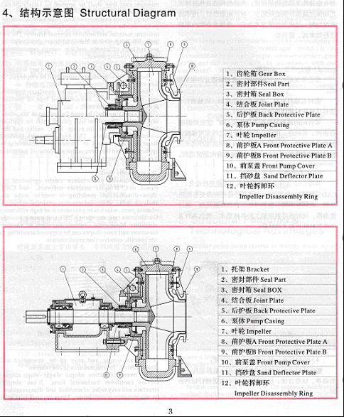 200TWN-500TWN型泵采用單泵殼、單級單吸懸臂臥式結構,按齒輪箱的連接方式均可提供兩種典型結構,即自帶托架式與泵箱合一式,自帶托架式潤滑方式為脂潤或稀油潤滑。