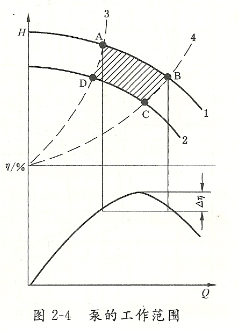 渣漿泵型譜圖上每個點對應一個工況,泵在最高效率點工作是最理想的,但這一要求并不現實,一般是規毫一個工作范圍,如圖2 4中的曲線1中的AB段,在此范圍內泵運行的效率下降不大。通過改變轉速或切割葉輪也可擴大泵的運行機制范圍,曲線2即是改變轉速或切割葉輪前后的特性曲線,藍線3、4是政變轉17“速的相似拋物線或是切割外徑的切割線(拋物線)。方塊ABCD稱為泵擴大了的工作范圍,泵可以在此范圍的任一點工作,而且效率下降最多不會超過5%~8%。把許多泵的工作范圍畫在一張坐標圖中,稱為渣漿泵型譜。為了使圖形協調,高揚程和大流量時的工作范圍不致過大(因高揚程大流量的工作范圍相對變大),通常采用對數坐標表示。一般每種系列渣漿泵有一個型譜。